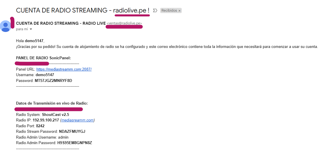 Te debe llegar de esta manera (ejemplo) donde estará tu ip, puerto y contraseña para emisión en vivo y ademas tu panel de radio.