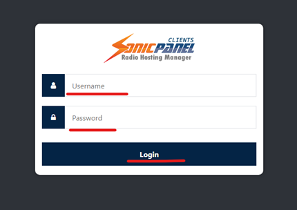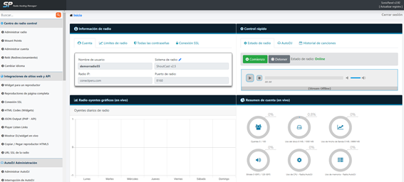 Luego de poner los datos correctos (usuario y contraseña de panel) ingresarán al panel de la cuenta de radio (SonicPanel)