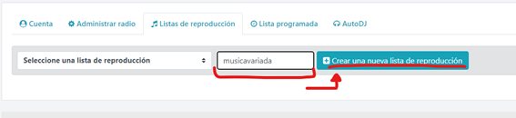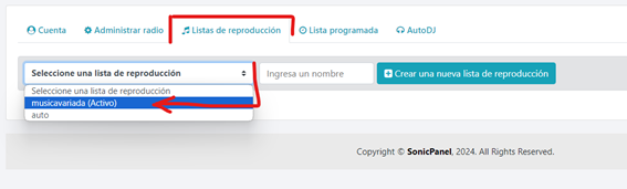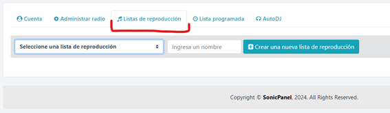 Luego nos dirigimos a la estaña de Lista de reproducción para escoger la carpeta donde subiremos ó eliminaremos los archivos.