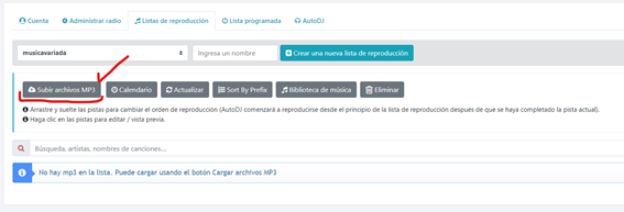 Luego de crear la carpeta para su lista de música puede subir sus canciones en formato MP3 (otros formatos no son compatible).