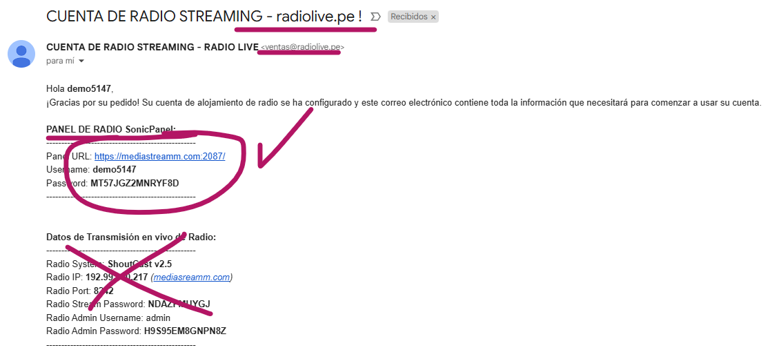 Ingresar a su panel de radio streaming con los datos que le llegó a su correo: